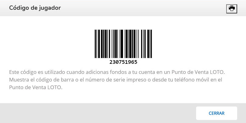 - Con este código podrás adicionar fondos a tu cuenta en un Punto de Venta LOTO. Muestra el código de barra o el número de serie impreso o desde tu teléfono móvil en el Punto de Venta LOTO.